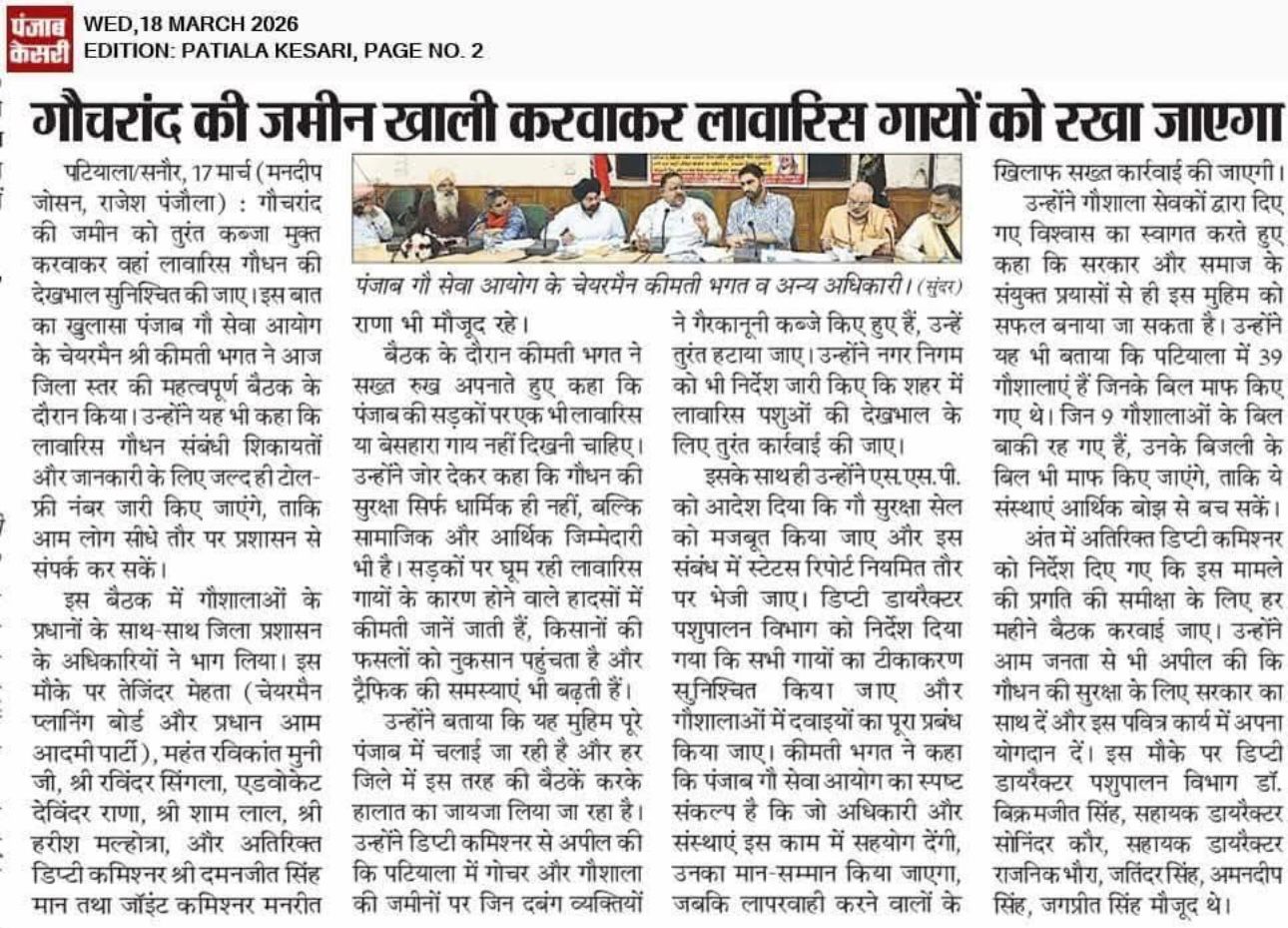 ਉਪ ਚੇਅਰਮੈਨ ਕੀਮਤੀ ਭਗਤ ਜੀ ਵੱਲੋ ਗਊਧੰਨ ਦੀ ਸੇਵਾ ਸੰਭਾਲ ਅਤੇ ਸੁਰੱਖਿਆ ਅਤੇ ਜਿਲ੍ਹਾ ਪਟਿਆਲਾ ਦੇ ਕੈਟਲ ਪਾਊਂਡ ਸਰਕਾਰੀ ਗਉਸ਼ਾਲਾ ਦਾ ਦੌਰਾ ਕਰਨ ਸਬੰਧੀ।