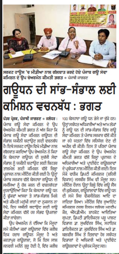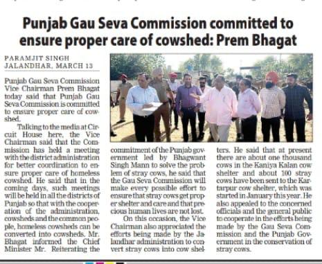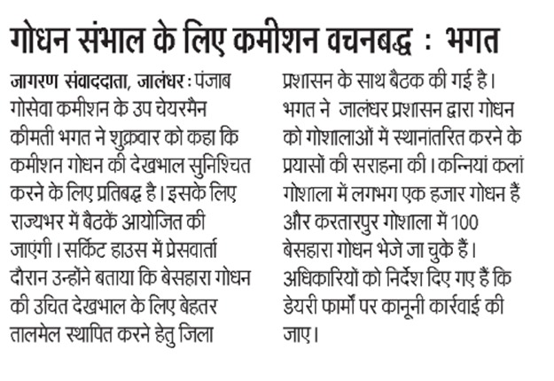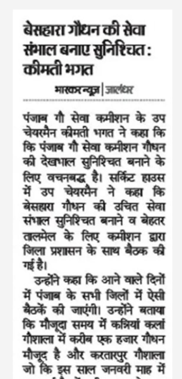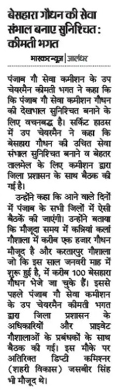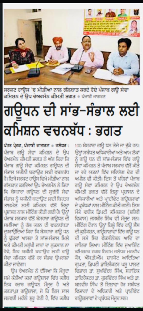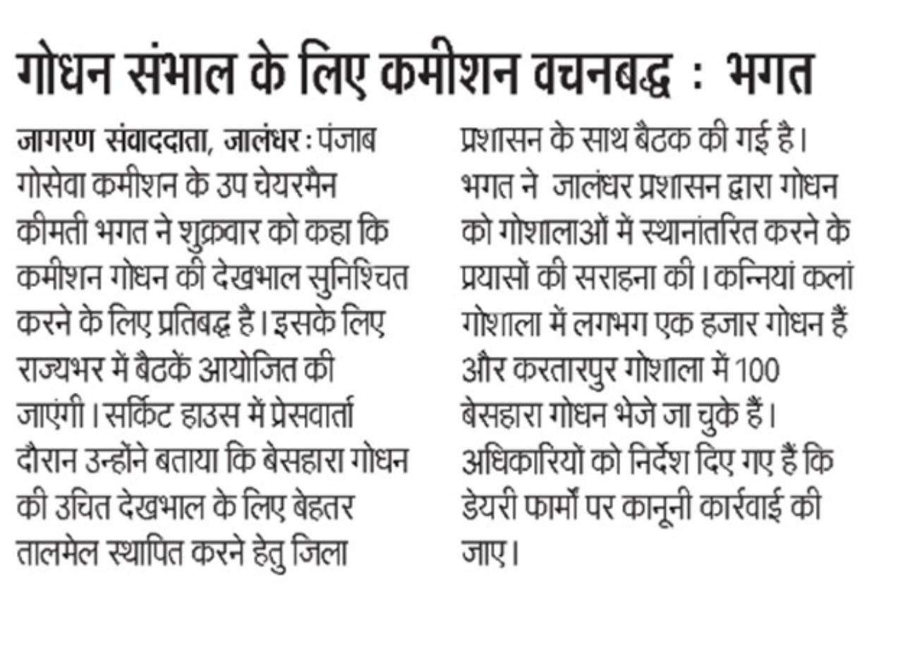 ਉਪ ਚੇਅਰਮੈਨ ਕੀਮਤੀ ਭਗਤ ਜੀ ਵੱਲੋ ਗਊਧੰਨ ਦੀ ਸੇਵਾ ਸੰਭਾਲ ਅਤੇ ਸੁਰੱਖਿਆ ਅਤੇ ਜਿਲ੍ਹਾ ਜਲੰਧਰ ਦੇ ਕੈਟਲ ਪਾਊਂਡ ਸਰਕਾਰੀ ਗਉਸ਼ਾਲਾ ਦਾ ਦੌਰਾ ਕਰਨ ਸਬੰਧੀ।