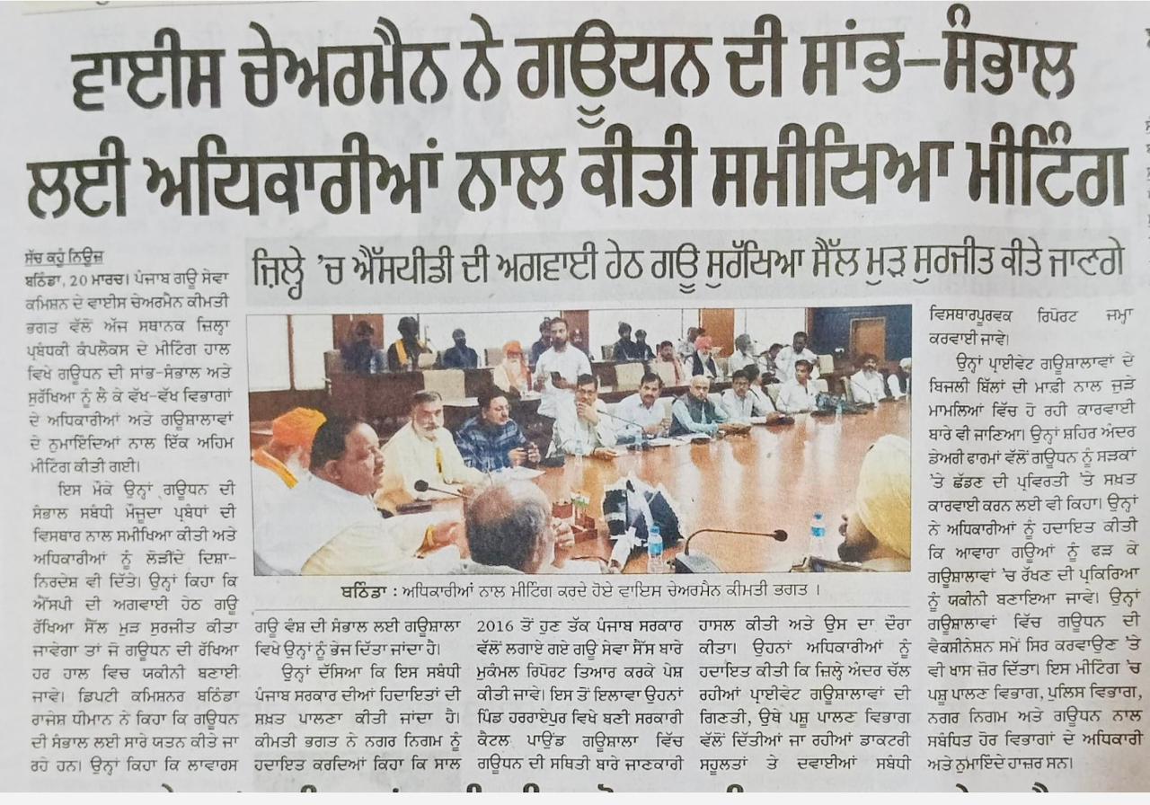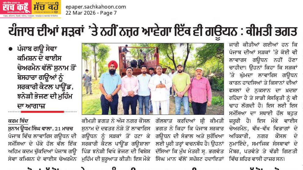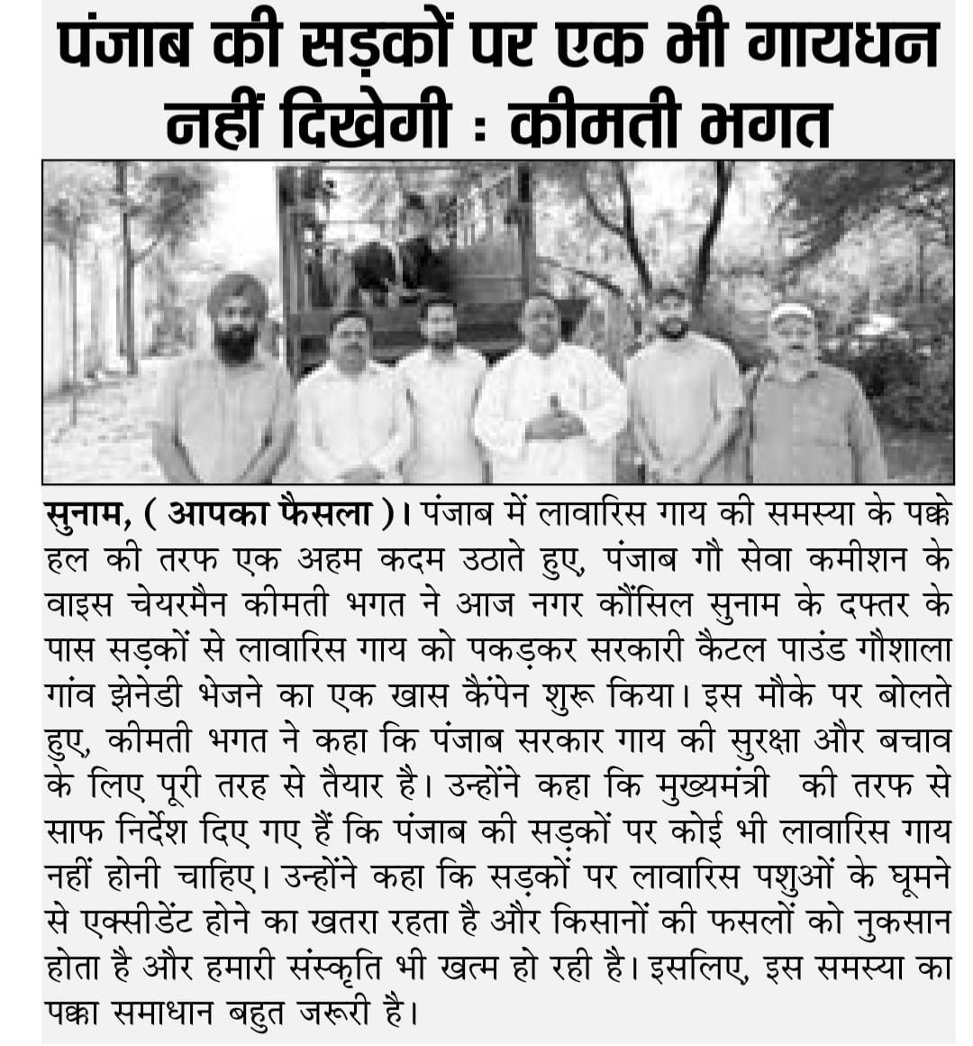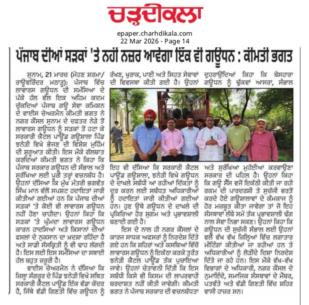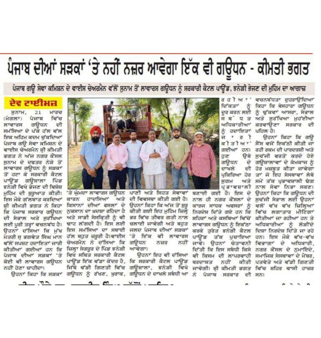 ਉਪ ਚੇਅਰਮੈਨ ਕੀਮਤੀ ਭਗਤ ਜੀ ਵੱਲੋ ਗਊਧੰਨ ਦੀ ਸੇਵਾ ਸੰਭਾਲ ਅਤੇ ਸੁਰੱਖਿਆ ਅਤੇ ਜਿਲ੍ਹਾ ਸੰਗਰੂਰ ਦੇ ਕੈਟਲ ਪਾਊਂਡ ਸਰਕਾਰੀ ਗਉਸ਼ਾਲਾ ਦਾ ਦੌਰਾ ਕਰਨ ਸਬੰਧੀ।
